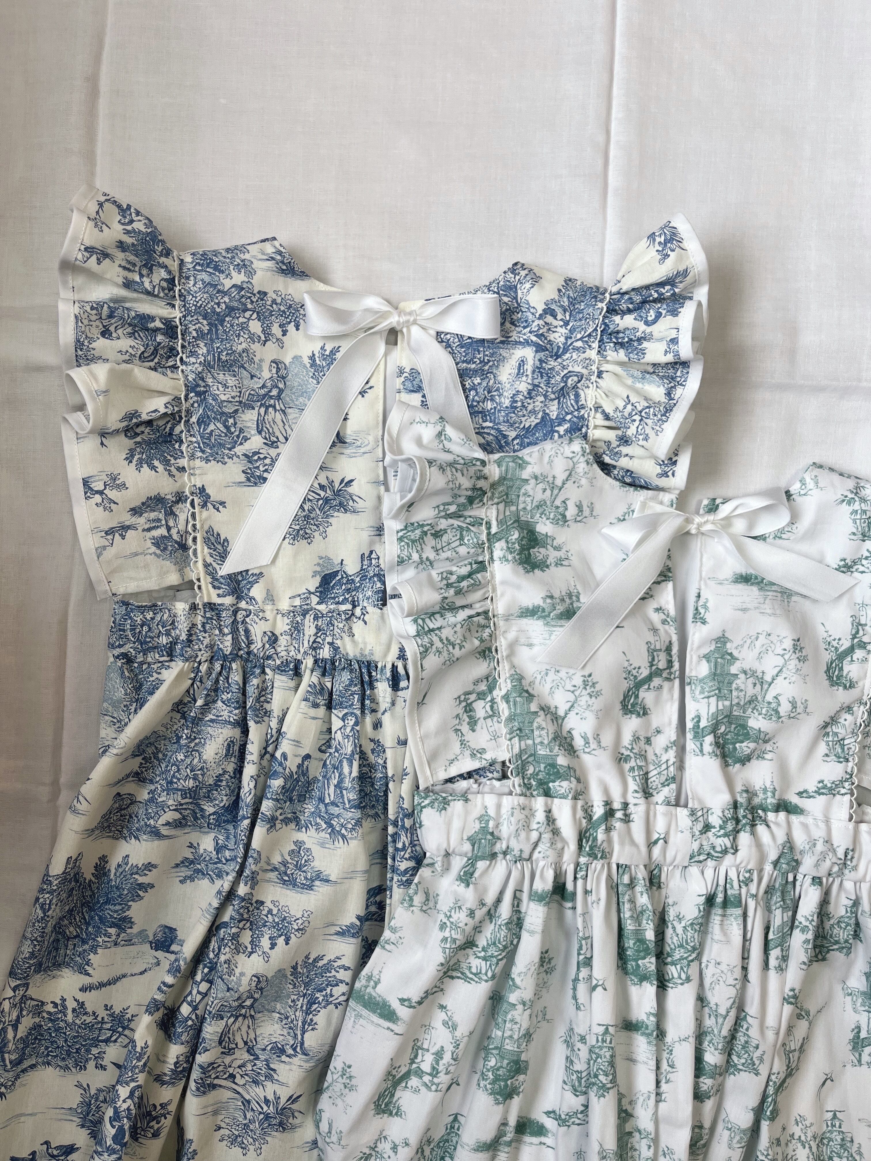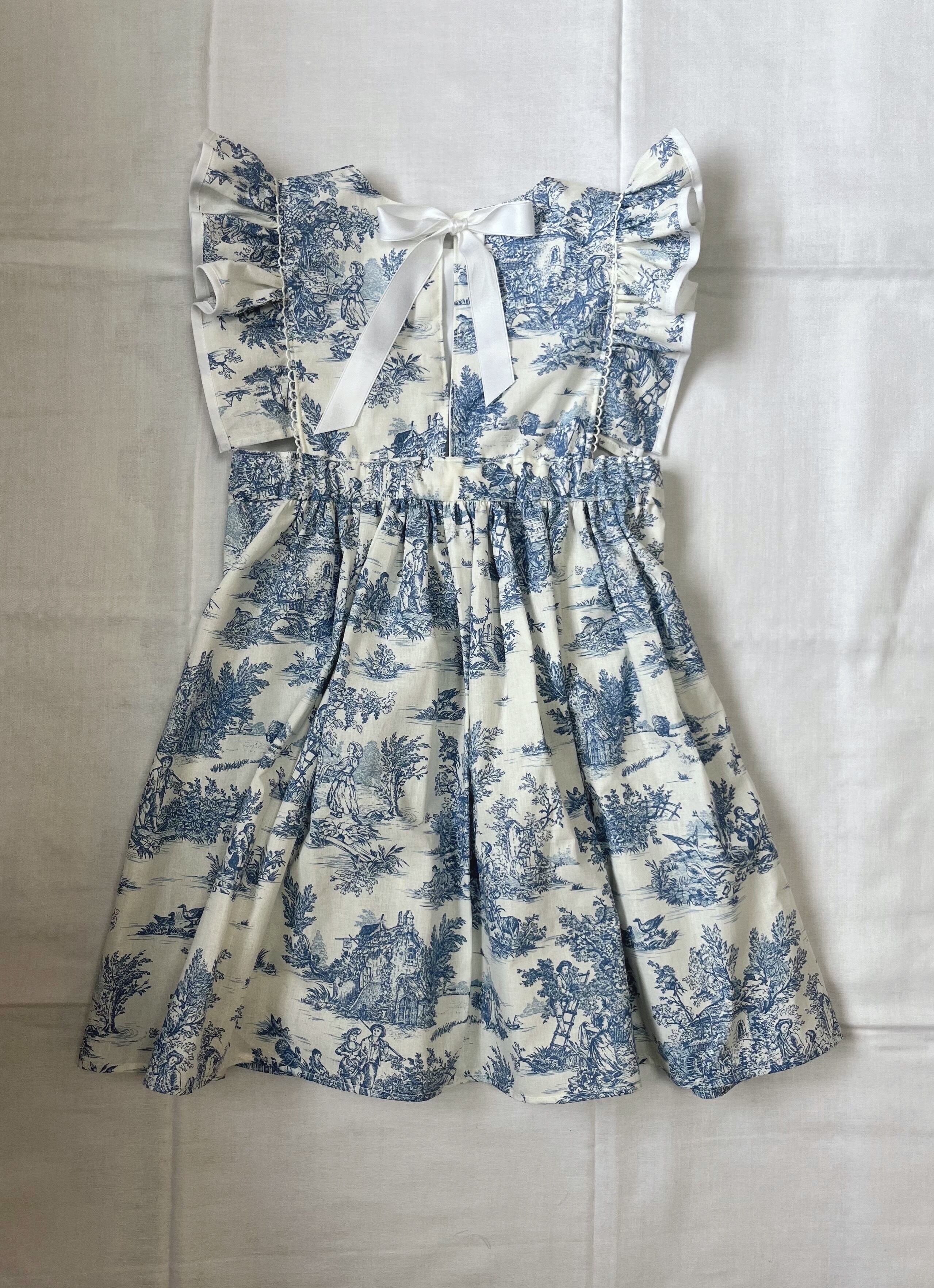 即納品110サイズ(トワルドジュイ/Toile de Jouy )総柄肩フリルエプロンワンピース