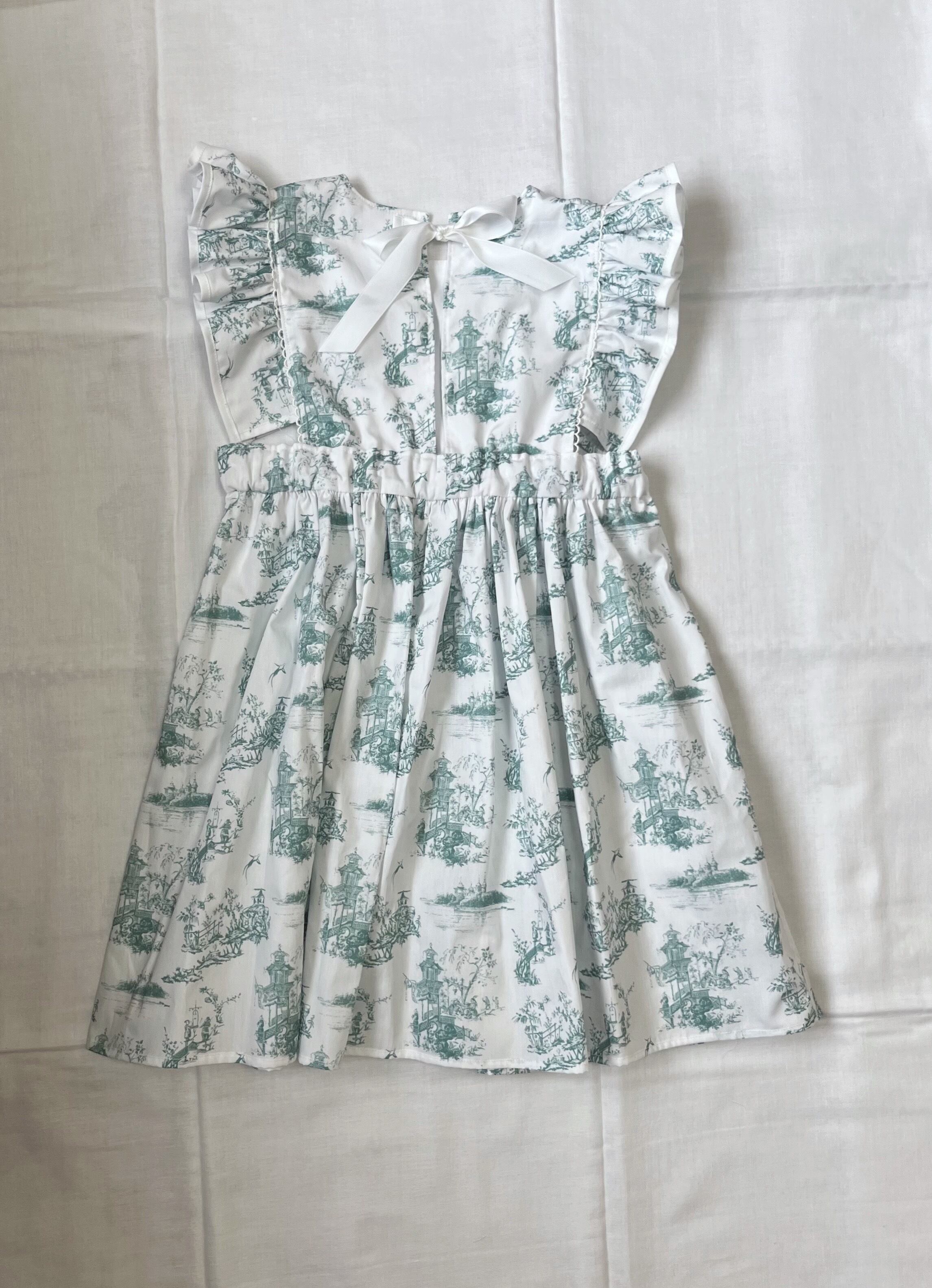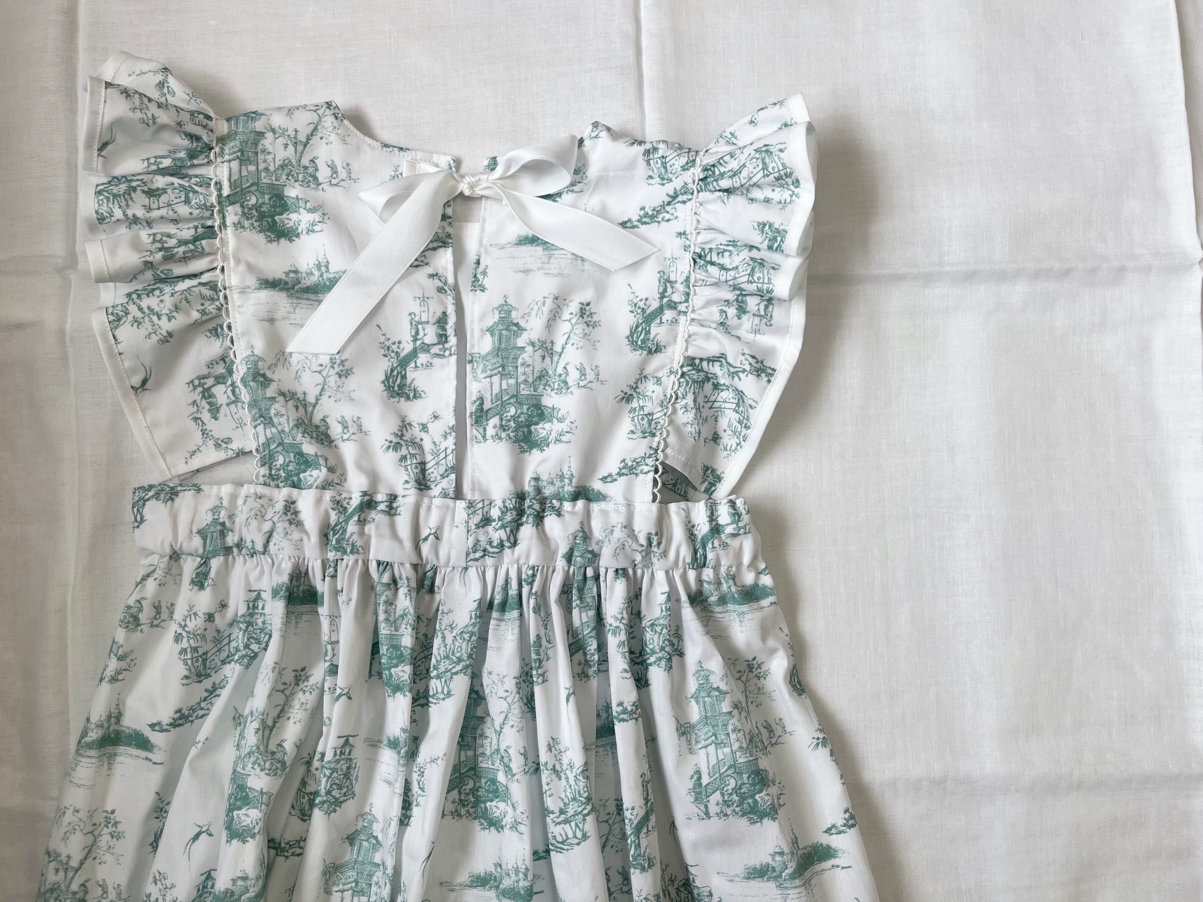 即納品110サイズ(トワルドジュイ/Toile de Jouy )総柄肩フリルエプロンワンピース