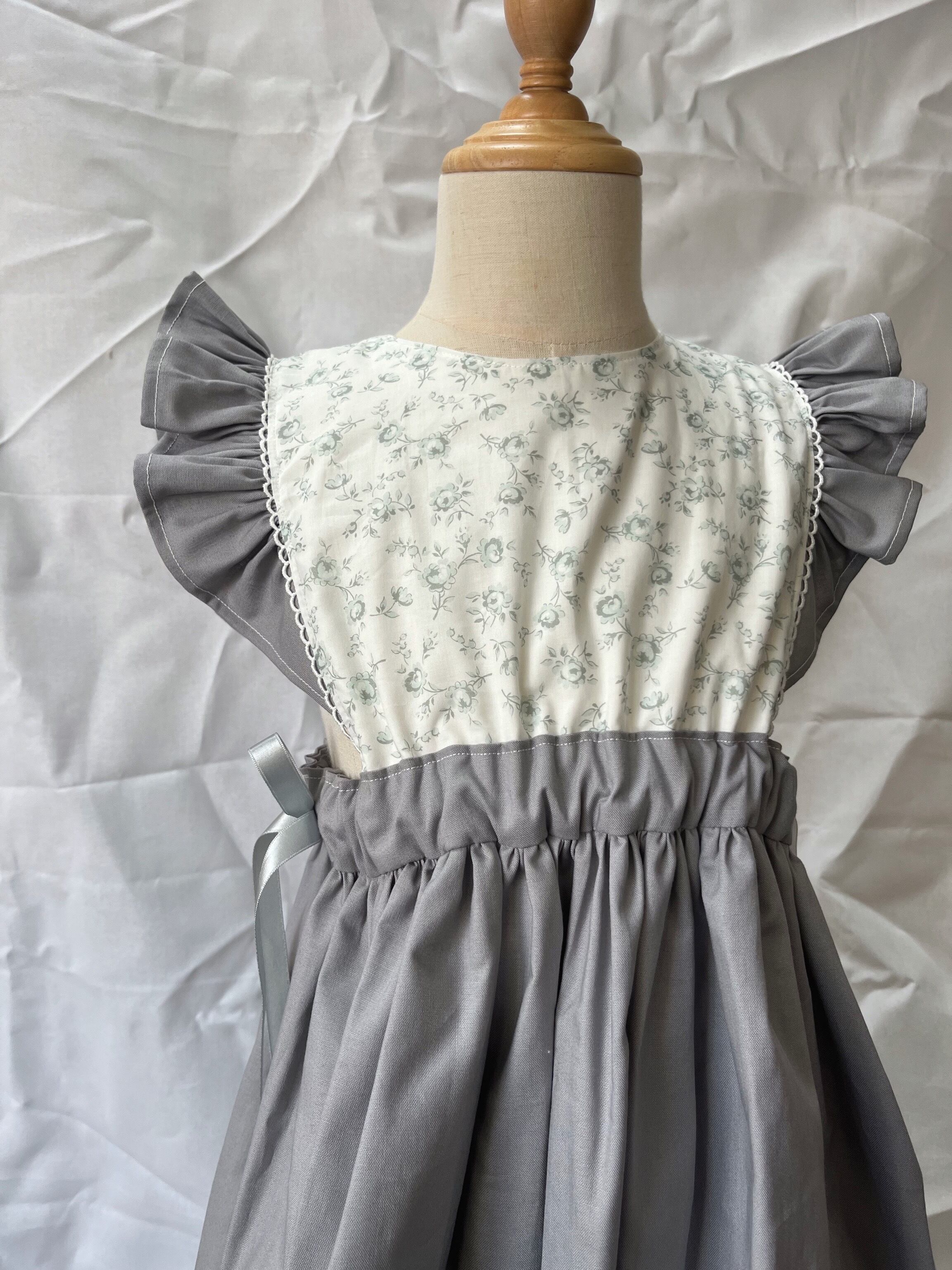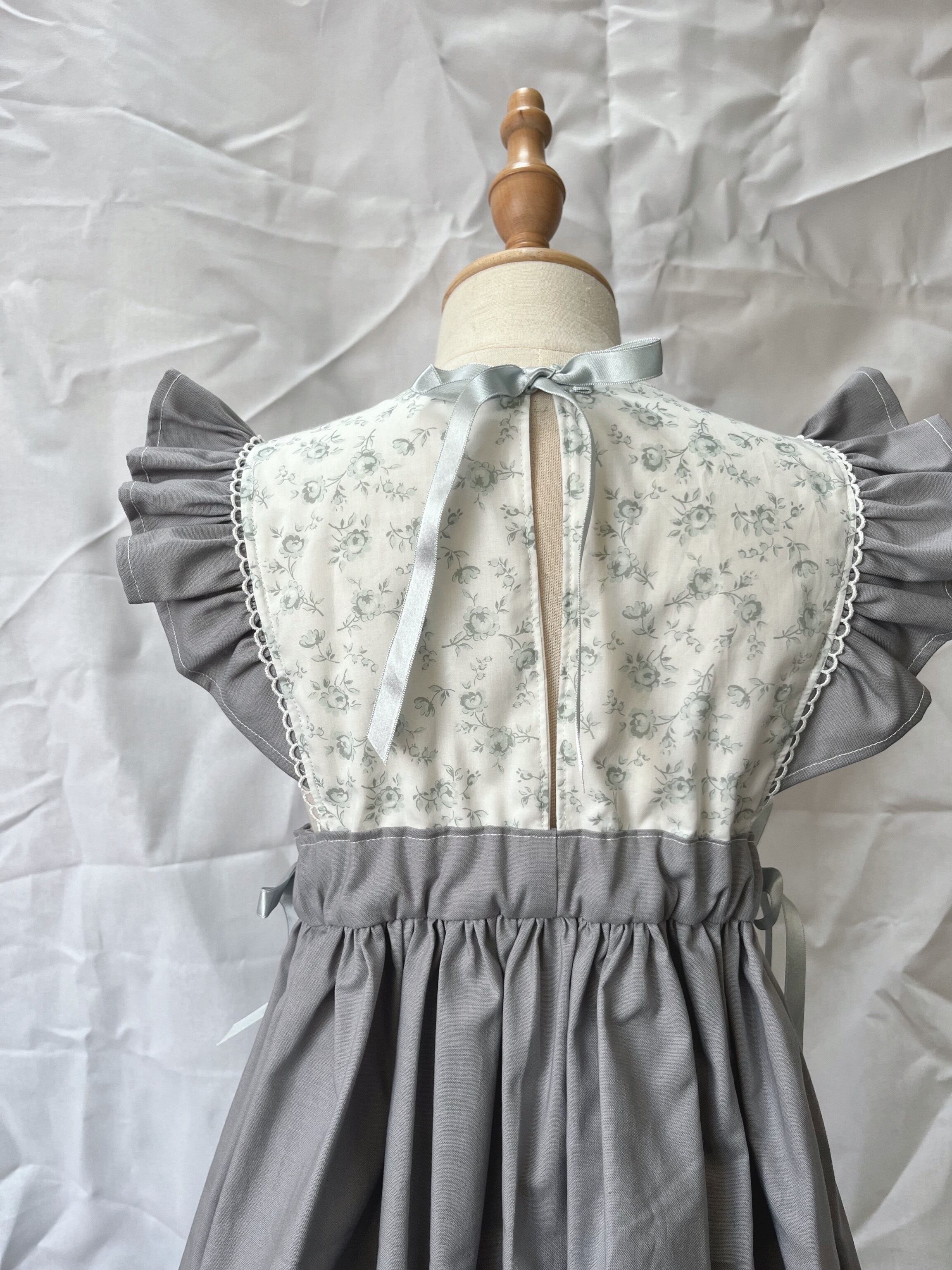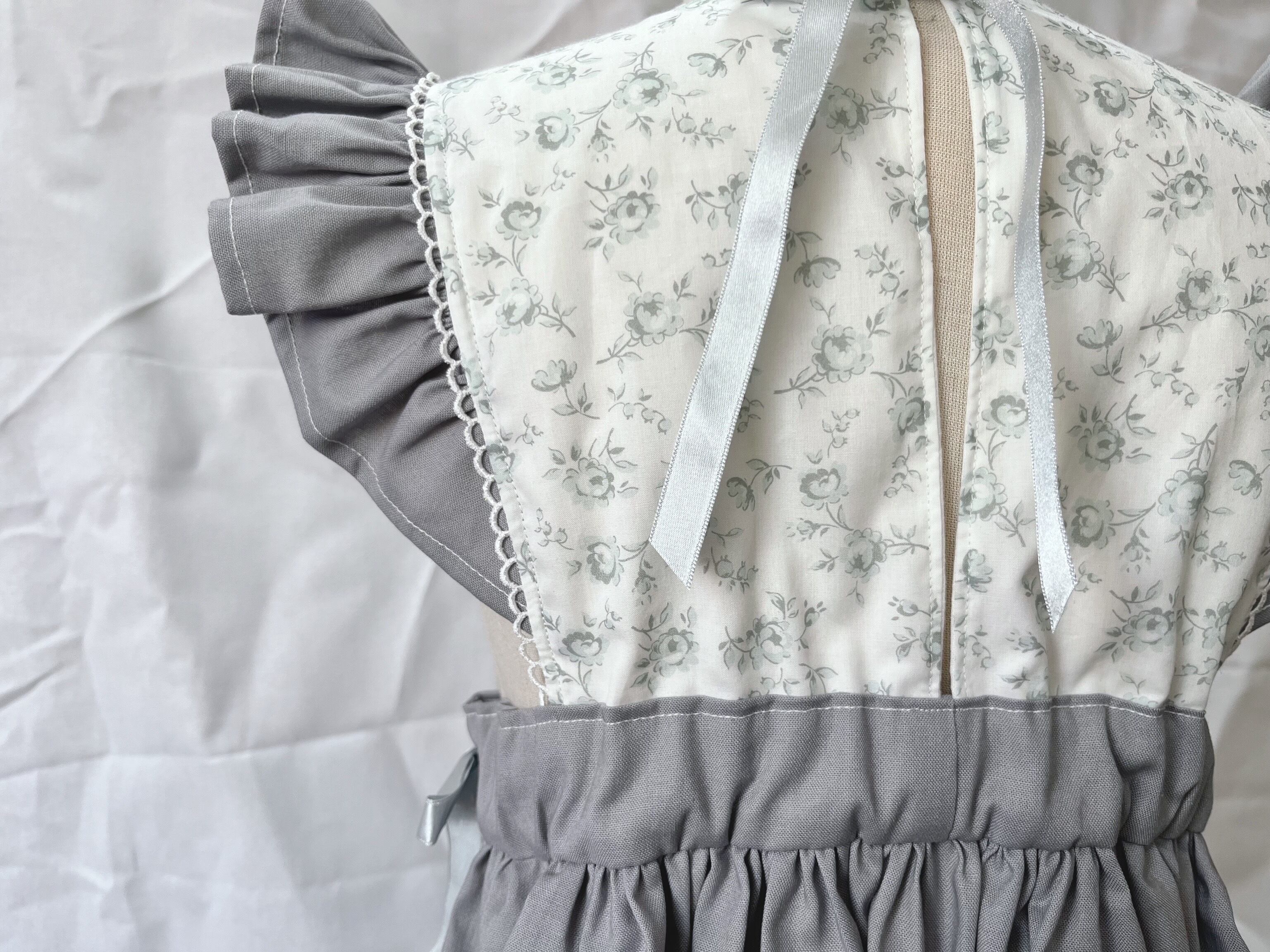 110サイズ(フランス輸入/Sous le figuier Fabrics使用)肩フリルエプロンワンピース(Rose d'antan Brume)