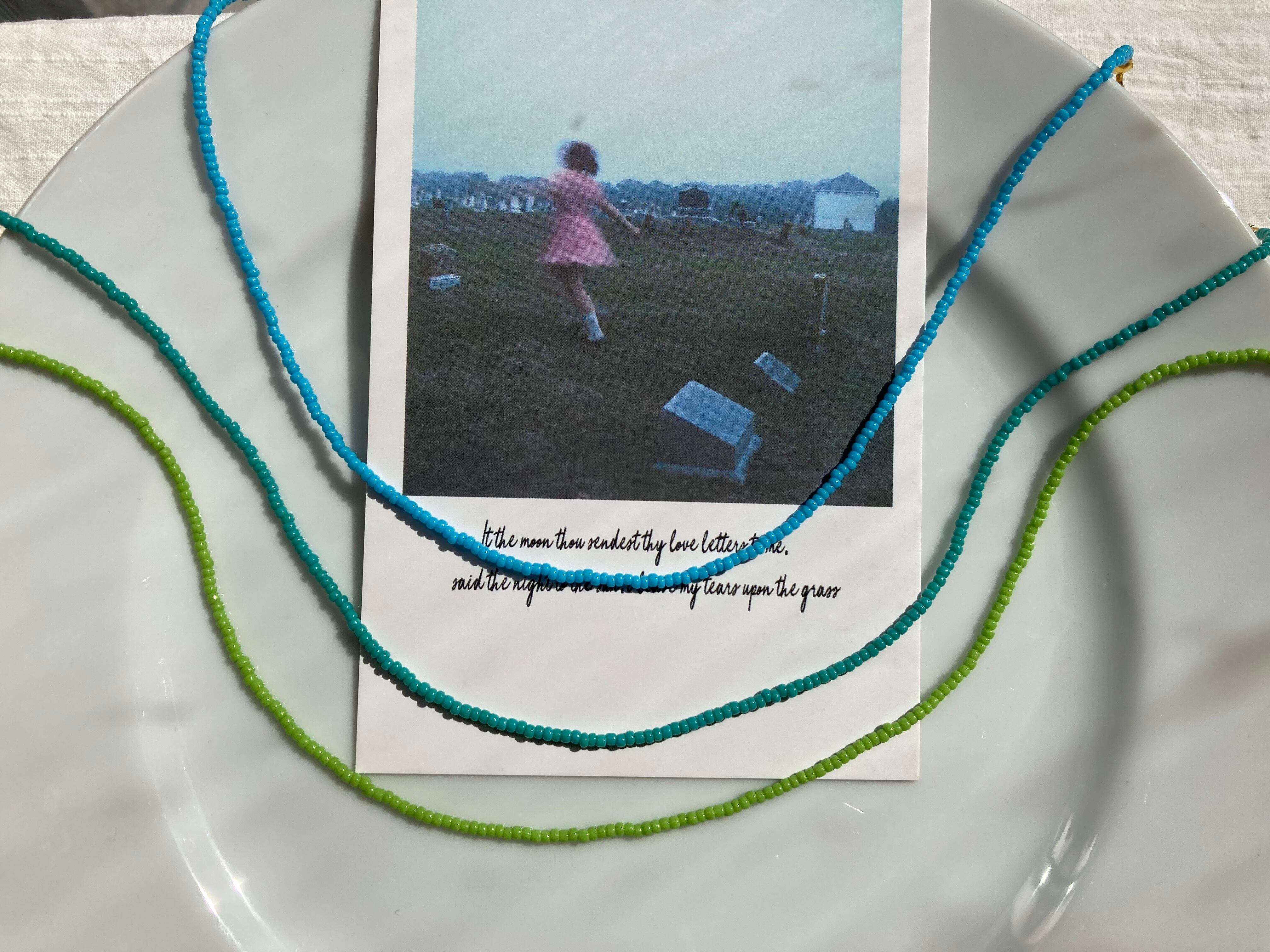 ビーズネックレスはテグス使用のため、強く引っ張ると切れてしまう可能性がございます。