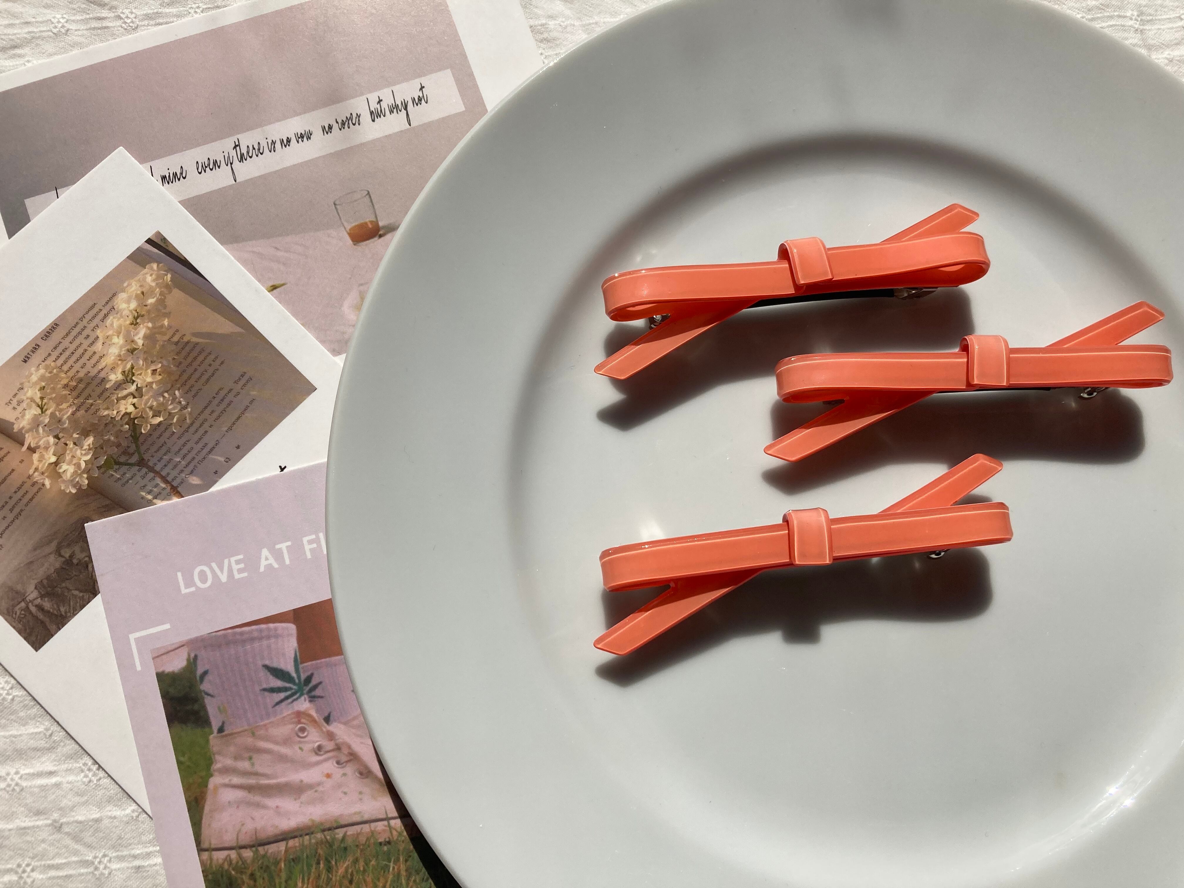 (新色オレンジ追加)リボンバレッタ(赤、グリーン、オレンジ)( ribbon barrette/ヘアアクセサリー)