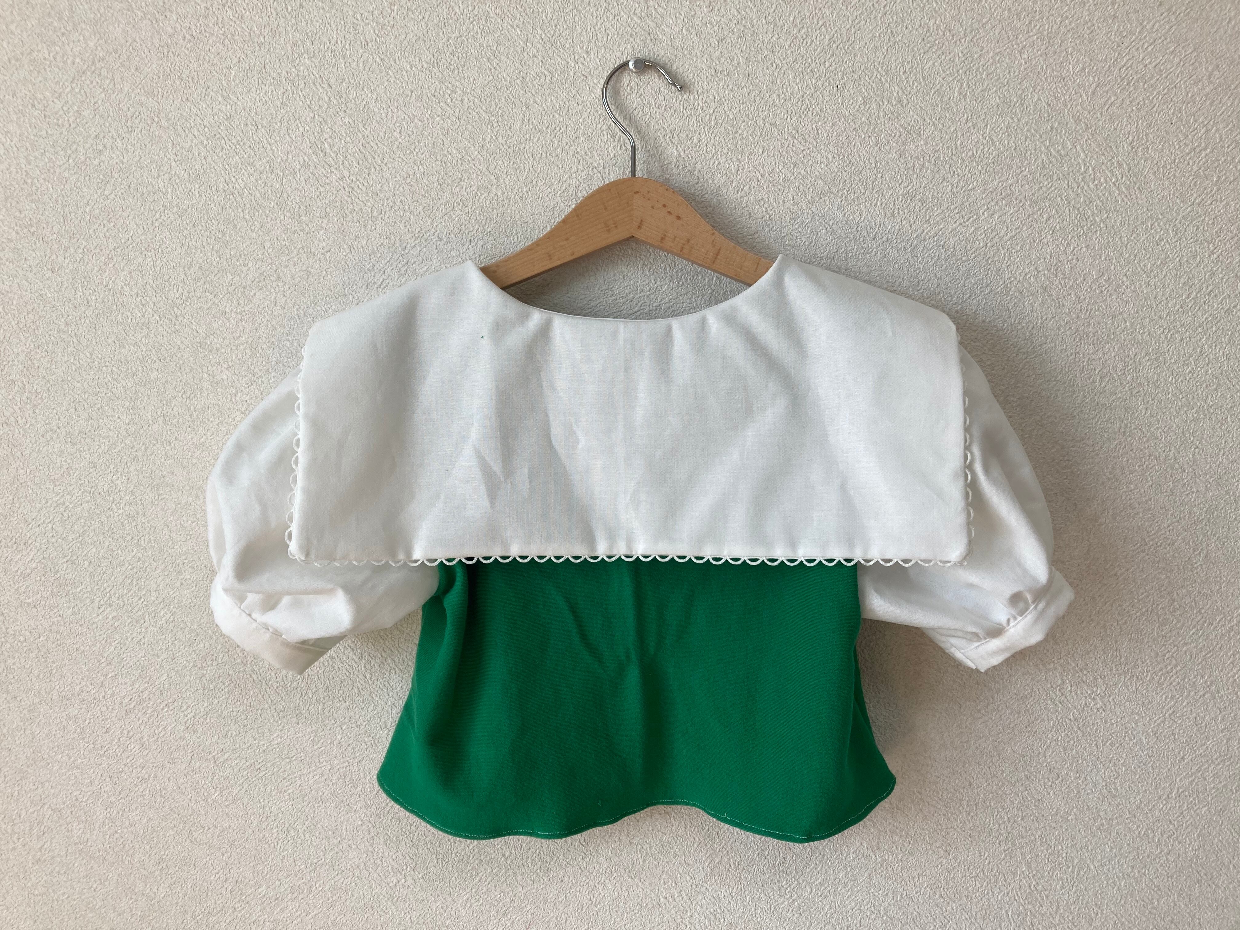 白×緑 半袖キッズトップス(kidstops/green tops)(ビッグカラー/ピエロカラー)