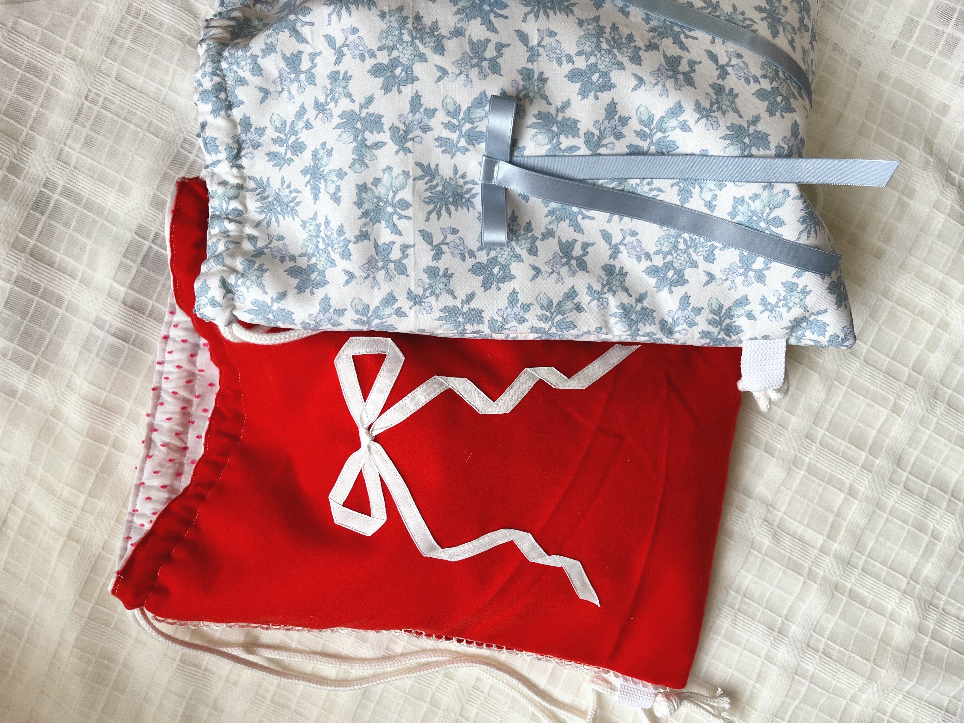 秋冬に向けた赤の起毛生地にリボンを縫い付け、裏地はCheck&Stripeのショッキングピンクのドットミニオンを使用しました◯