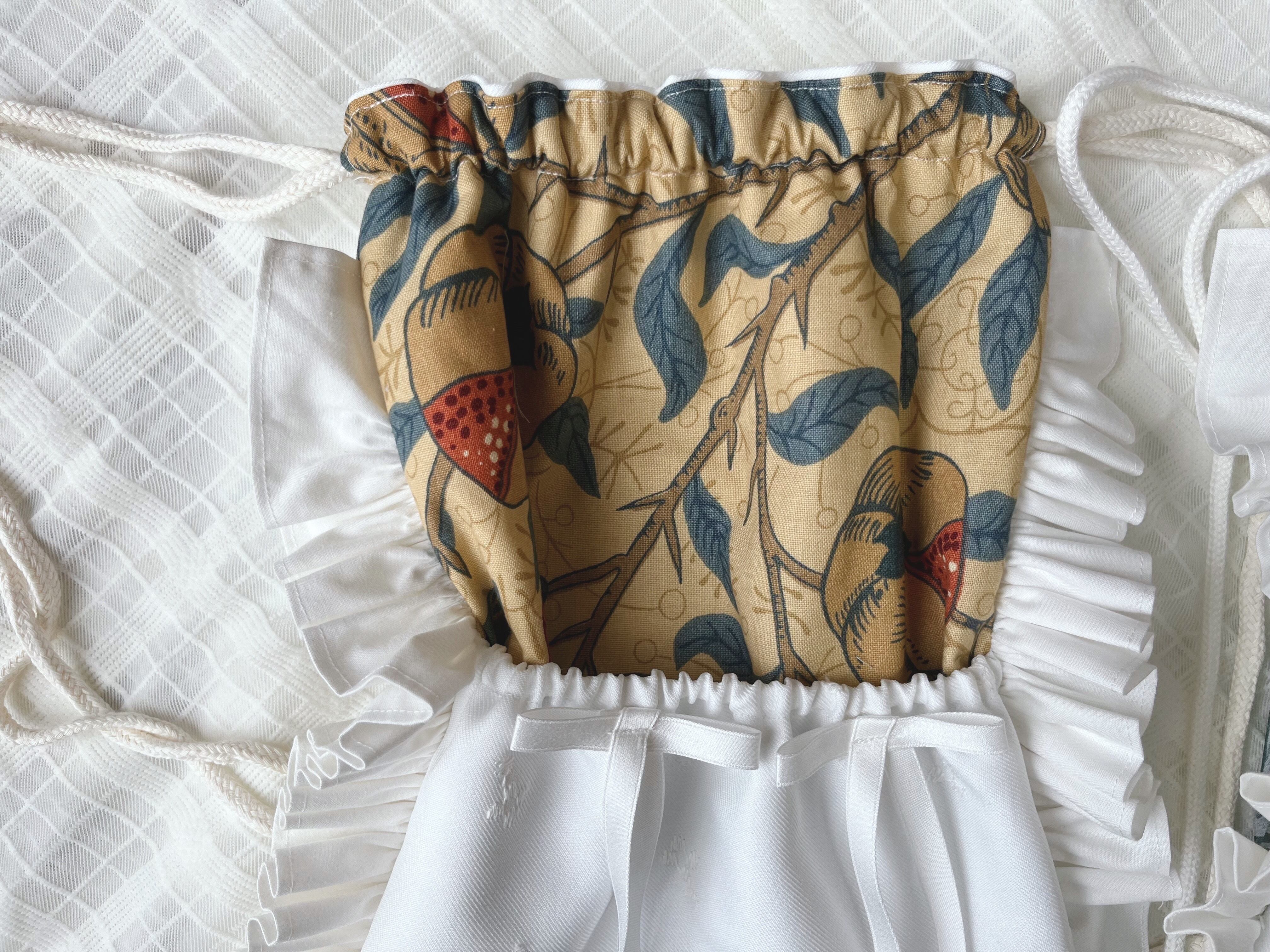 輸入生地のウィリアムモリスのフルーツ生地とミントグリーンのピンパーネルを使用。